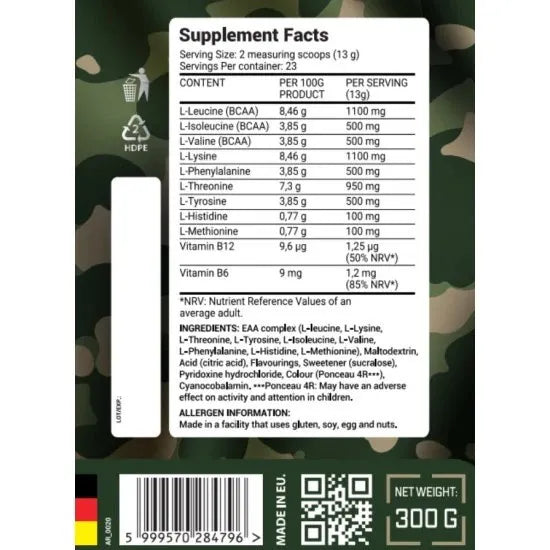 ARMY 1 EAA COMPLEX is a great-tasting, powerful formula, packed with all 9 essential Amino Acids, plus added Vitamins B12 and B6.