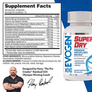 Using a potent blend of electrolytes and specialized herbal ingredients, Super Dry can help you shed excess water or reduce bloating. This potent array of carefully selected and time-tested ingredients helps you maximize definition with ease. Whether you’re stepping onto the stage, a photoshoot, or just trying to lose some excess water prior to hitting the beach, Super Dry can deliver. †