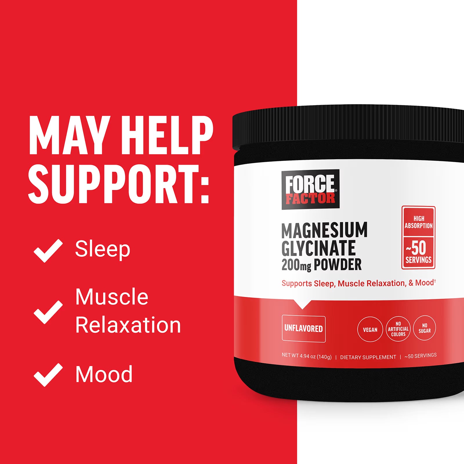 MADE TO HELP YOU SLEEP DEEPERForce Factor® Magnesium Glycinate Powder is your daily essential for holistic health. Formulated to support a calm mood, muscle relaxation, better sleep, and more, every dose provides high-absorption magnesium powder that is gentle-on-the-stomach and perfect for both women and men. If you’re looking for a simple and powerful way to optimize your health and wellbeing, make Magnesium Glycinate part of your daily routine.