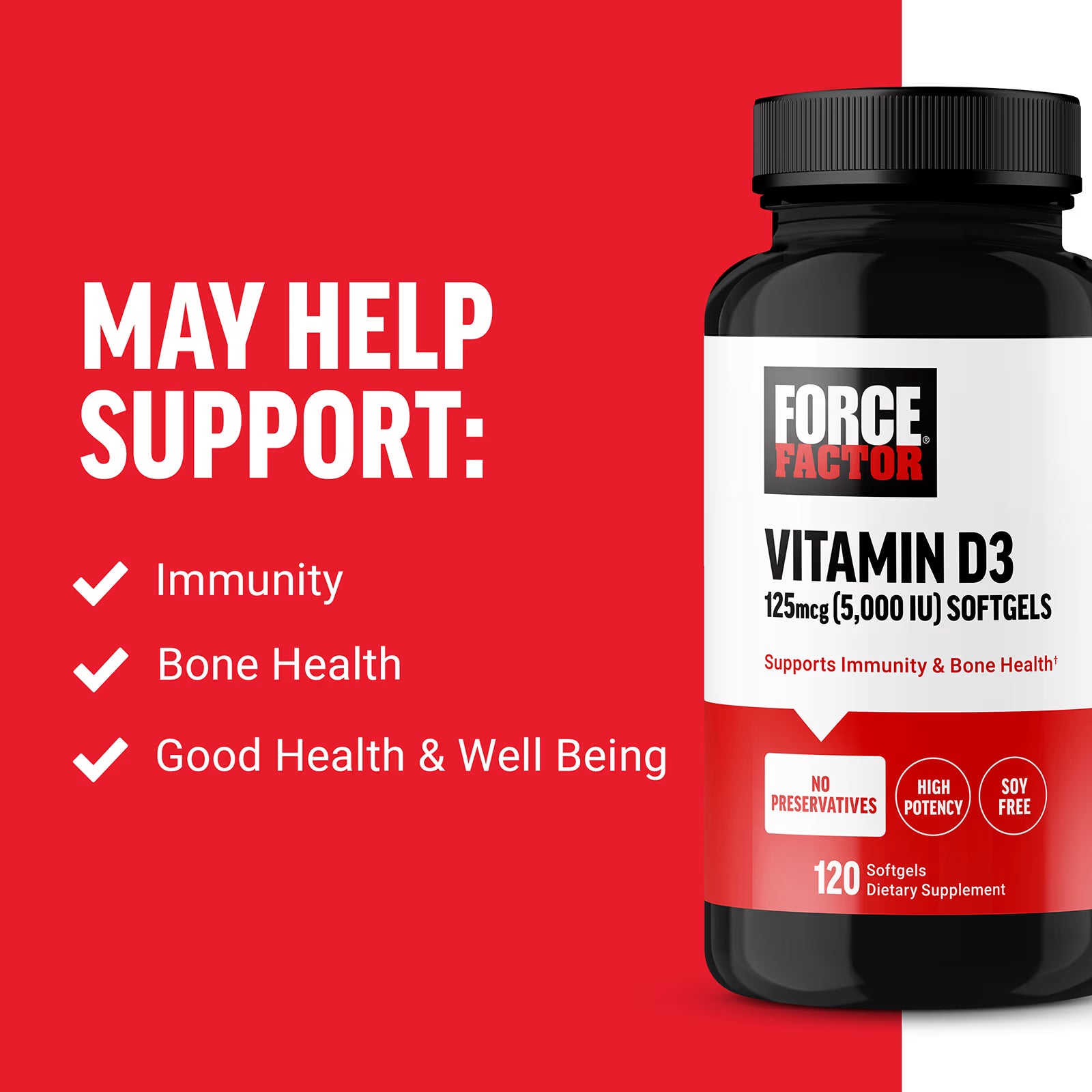 SUPPORT IMMUNITY, BONE HEALTH, & MOREForce Factor® Vitamin D3 is a premium quality, high-potency formula made to support total wellness. Every dose provides a potent 5,000 IU of vitamin D3, an essential vitamin scientifically shown to support immune function, bone health, and more.