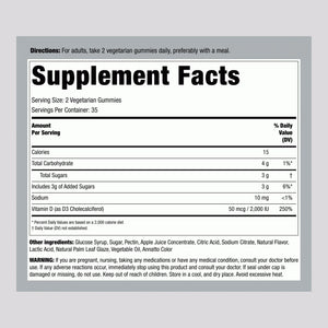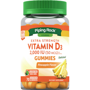 Your daily vitamin D just got more delicious. Piping Rock D3 gummies provide a blast of pineapple flavor that will send your tastebuds to a tropical paradise! They’re also highly nutritious, providing 50 mcg/2,000 IU of vitamin D per serving, 250% of your daily recommended value.