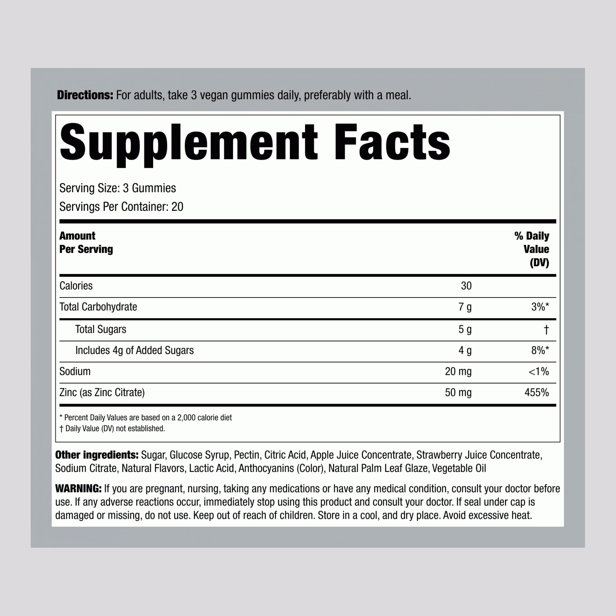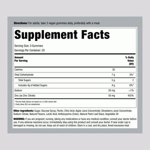 Piping Rock’s Extra Strength Zinc Gummy Supplement is the satisfying way to receive your daily zinc from mixed berry flavor gummies, with no metallic aftertaste! Our gummies are specially crafted with pectin, making them not only tasty but also vegan-friendly. They’re Gluten Free, non-GMO, and contain no artificial colors or artificial sweeteners. You deserve honest nutrition, which is why we’ll never compromise on quality.