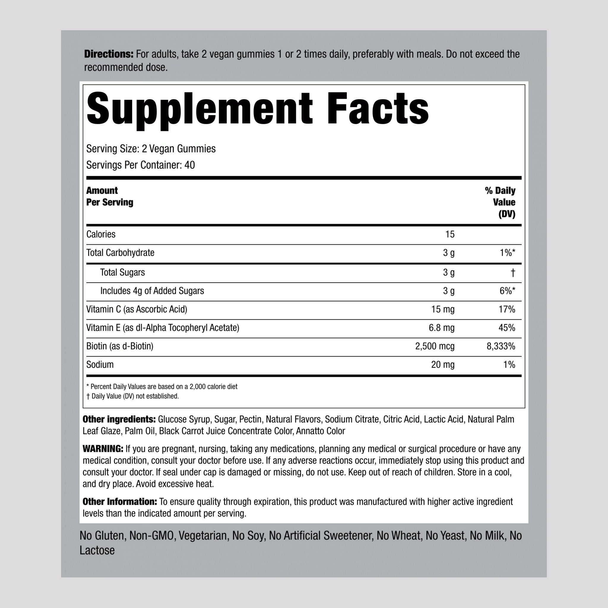 t Piping Rock, our advanced formula features a synergistic blend of beautifying nutrients that are designed to help you feel flawless from the inside, out! Each serving contains 2,500 mcg of Biotin plus Vitamins C and E. Vegan gummies are bursting with delicious fruit flavor, making them an excellent addition to your routine!