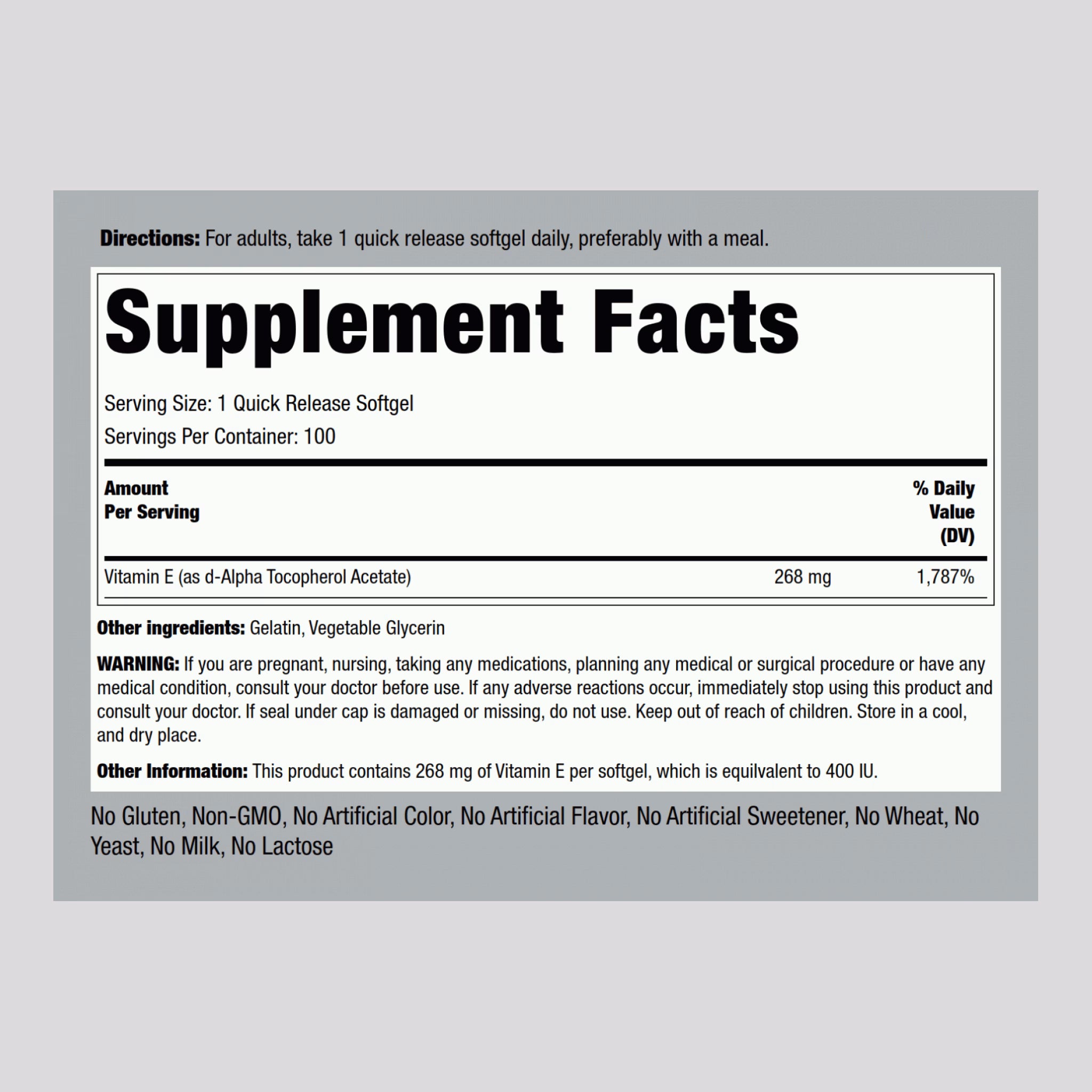 We are proud to bring you this important nutrient in our quick release, easy-to-swallow softgels. Piping Rock Natural E-400 IU strikes the perfect balance between quality and value, making it easy and affordable to support vibrant overall health!**