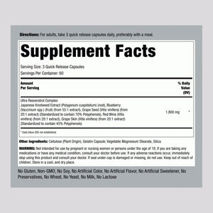 Our Resveratrol Complex quick release capsules feature 1800 mg of an Ultra Resveratrol Complex, equivalent from a proprietary blend of Japanese Knotweed Extract, Grape Seed 20:1 Extract, Red Wine 4:1 Extract, Blueberry 55:1 Extract, and Grape Skin 20:1 Extract per serving.