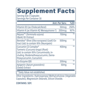 Rejuna: A wild-crafted arjuna extract known for its cardiovascular support and antioxidant properties, helping to lower blood pressure and improve blood flow.
