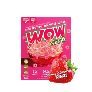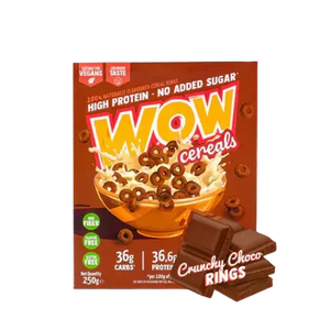 Start your day with WOW HIGH PROTEIN CEREALS Ring 250g, a 100% natural breakfast cereal available in candy, chocolate, and strawberry flavors. This high-protein cereal contains an impressive 34.5g to 36.6g of protein per serving and only 1.4g of sugar, making it the perfect choice for a nutritious and delicious breakfast. Enjoy the natural energy boost and start your day with a smile.
